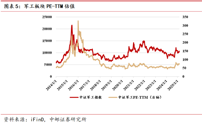 截至2025年2月28日,中证军工指数为10288.33,军工板块PE-TTM估值为72.96,军工板块PB估值为3.31。军工板块PE-TTM估值和PB估值均处于历史中部位置,自2014年1月1日起,历史上有64.80%的时间板块PE-TTM估值低于当前水平,40.19%的时间板块PB估值低于当前水平。
