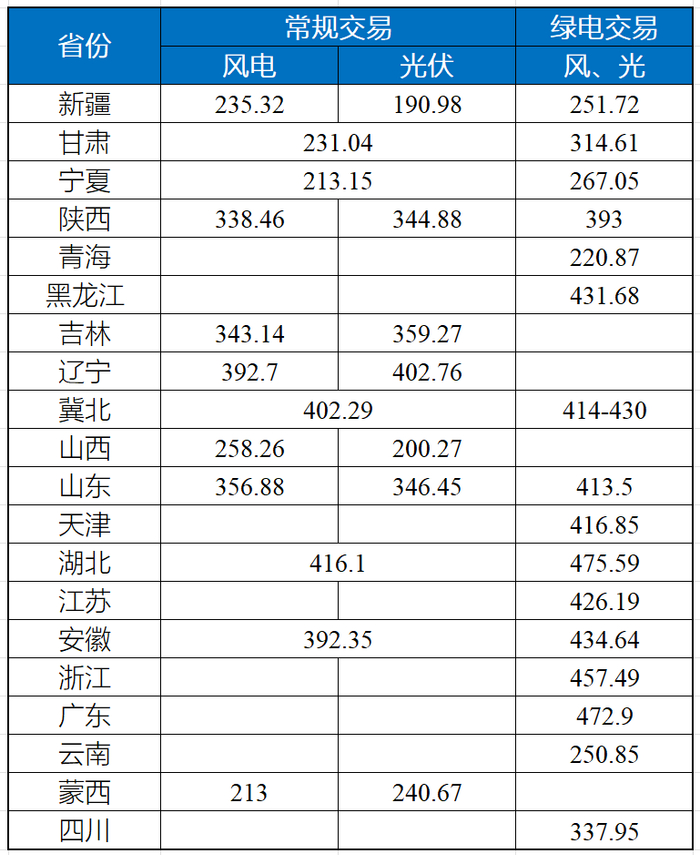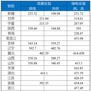 表:部分省份2024年的新能源交易价格(单位:元/MWh)