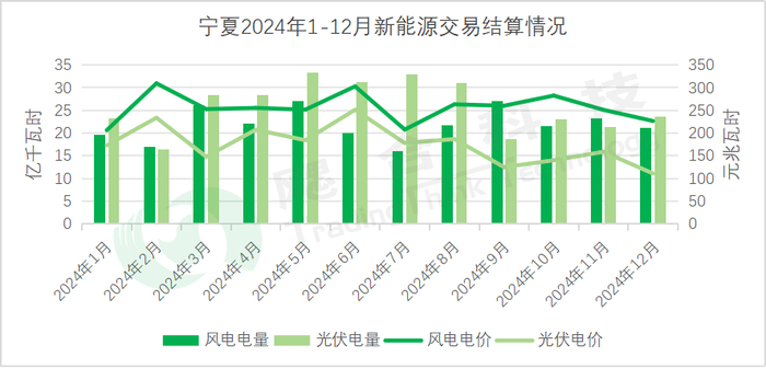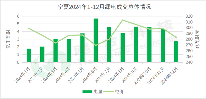 2024年宁夏绿电共成交26.69亿千瓦时,均价267.05元/兆瓦时。