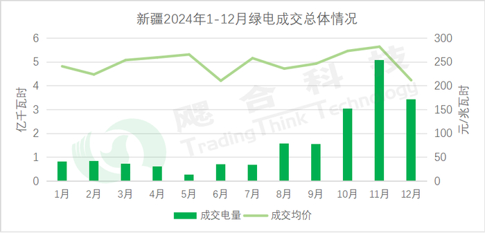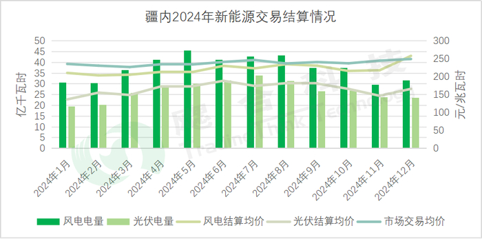 2024年疆内绿电交易电量19.39亿千瓦时,成交均价251.72元/兆瓦时。