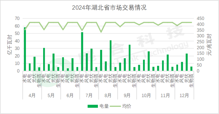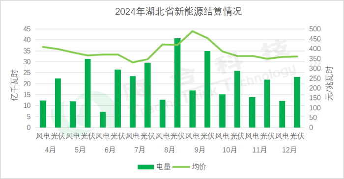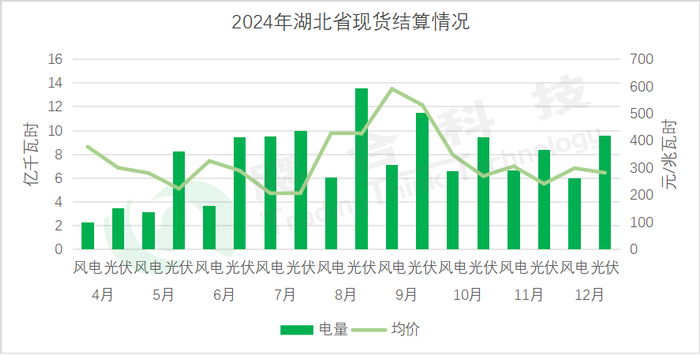 湖北4月16日电力现货市场开展后,新能源部分上网电量按照优先上网电量结算,视作保障性收购电量。2024年4-12月结算均价332.22元/兆瓦时。