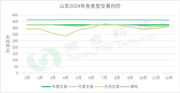 目前山东中长期交易市场参与主体以火电为主,交易电量规模以年度交易和月度交易为主,2024年中长期市场累计交易电量2650.84亿千瓦时,交易均价367.14元/兆瓦时左右,其中年度交易均价374.78元/兆瓦时,月度交易均价371.53元/兆瓦时,月内交易均价346.88元/兆瓦时。山东省2024年绿电交易均价在413.50元/兆瓦时左右,波动较小,绿色环境权益溢价约为22.4元/兆瓦时。