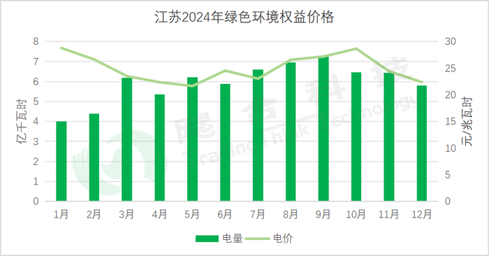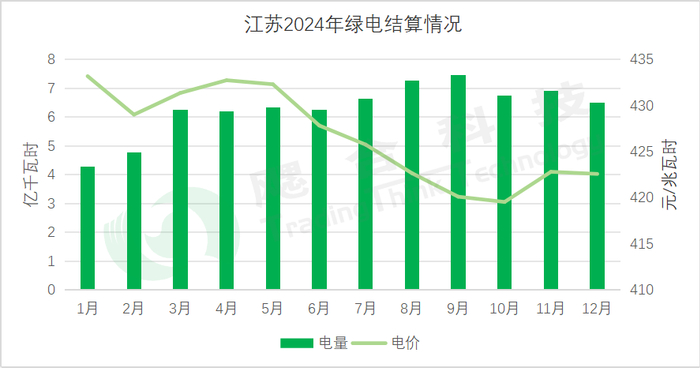 2024年江苏绿电结算均价426.19元/兆瓦时,绿色环境权益均价24.92元/兆瓦时。