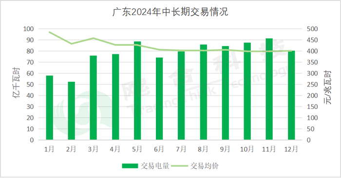 2024年广东月度中长期电量共936.15亿千瓦时,交易均价418.04元/兆瓦时,其中广东月度双边协商成交电量共841.85亿千瓦时,成交均价为419.22元/兆瓦时;月度集中竞争成交电量为94.3亿千瓦时,成交均价为413.98元/兆瓦时。