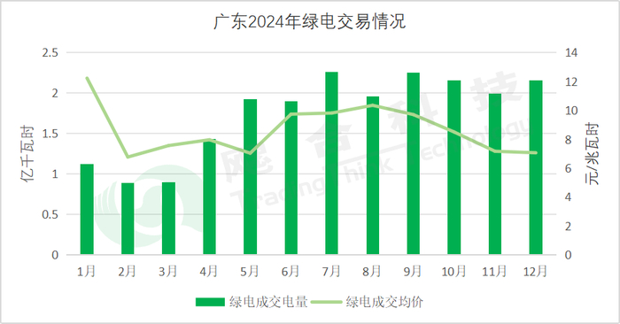 2024年广东月度绿电交易成交电量共20.94亿千瓦时,环境价值成交均价8.70元/兆瓦时。