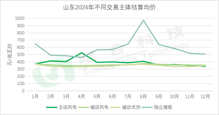 山东2024年,光伏全部采用被动入市,结算均价346.45元/兆瓦时,被动入市风电结算均价356.88元/兆瓦时,主动入市风电结算均价为383.40元/兆瓦时,独立储能结算均价576.57元/兆瓦时。主动入市风电在9~12月结算均价较被动入市风电结算价格有小幅度下降,主要原因在于中长期成交价格较低。
