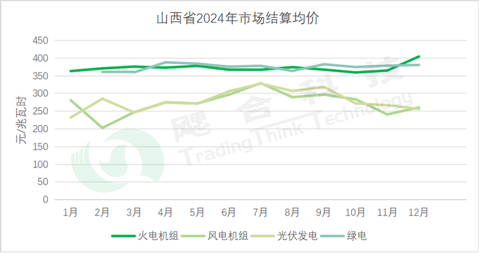 2024年,山西现货机组结算上网电量1452.98亿千瓦时,结算均价343.45元/兆瓦时。其中,火电机组全年结算均价373.11元/兆瓦时,风电机组全年结算均价258.26元/兆瓦时,光伏机组全年结算均价200.27元/兆瓦时。