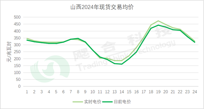 2024年山西省现货日前均价312.18元/兆瓦时,实时均价323.21元/兆瓦时。现货市场整体呈现出峰谷价差明显的形态,中午时段价格最低,早晚高峰价格较高,晚间19点达到价格峰值。