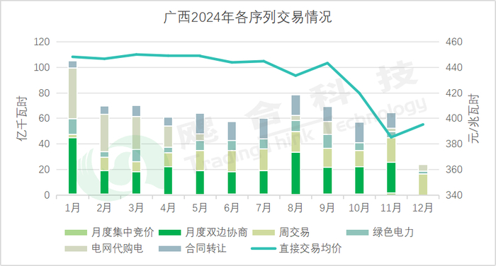 广西2024年累计直接交易成交电量1102.48亿千瓦时,平均成交价格444.85元/兆瓦时,较燃煤基准上网电价上涨24.15元/兆瓦时,其中绿色电力共成交87.89亿千瓦时,环境溢价均价为17.34元/兆瓦时。从10月开始交易价格开始极速降低,至12月平均成交价降至406.70元/兆瓦时,较燃煤基准上网电价下降14元/兆瓦时。