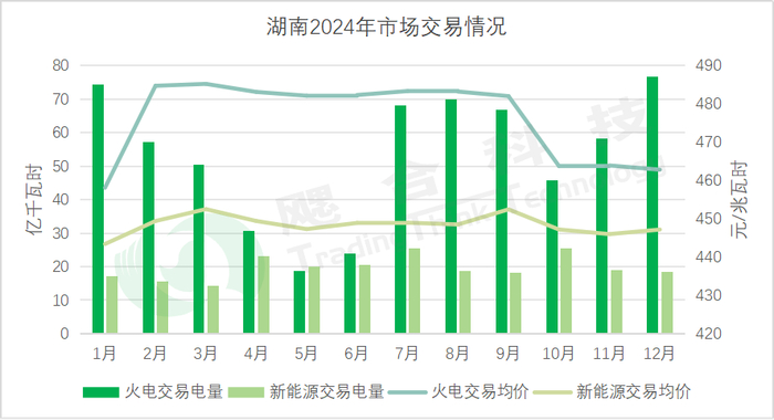 2024年1-12月湖南电力市场化交易合计交易电量876.46亿千瓦时,交易平均价差上浮17.69元/兆瓦时。其中新能源交易合同电量236.07亿千瓦时,平均交易价差下浮1.64元/兆瓦时;外购电中进入市场电量218.6亿千瓦时,平均交易价差上浮15.18元/兆瓦时。