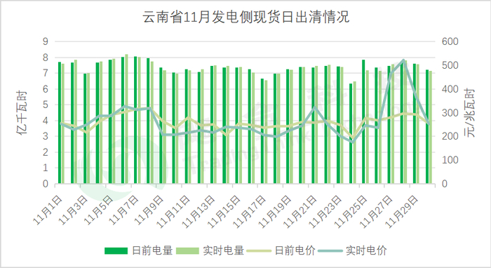 云南2024年四季度均开展了现货结算试运行,3月28-31日现货平均结算价格为301.91元/兆瓦时;6月6、7日及24-30日现货平均结算价格为245.59元/兆瓦时;8月22-31日发电侧日前平均电价为224.87元/兆瓦时,实时平均电价为284.84元/兆瓦时;11月整月发电侧日前平均电价为261.75元/兆瓦时,实时平均电价为267.62元/兆瓦时。
