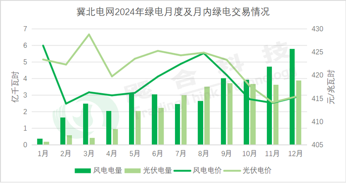 冀北地区2024年月度及月内绿电交易电量呈上升趋势,交易价格在414-430元/兆瓦时之间。其中风电交易电价略低于光伏。