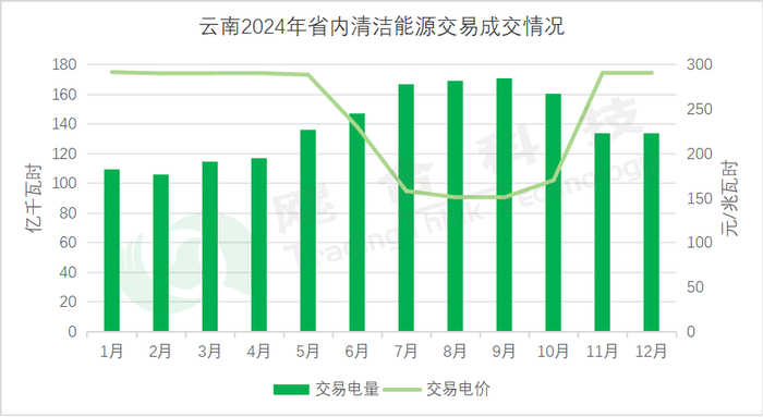 2024年1-12月,云南省内市场化交易电量共2101.67亿千瓦时,其中清洁能源交易成交电量为1664.71亿千瓦时,成交均价为231.76元/兆瓦时;绿电交易成交电量为16.63亿千瓦时,电能量价格成交均价228.93 元/兆瓦时,环境溢价成交均价21.92元/兆瓦时。