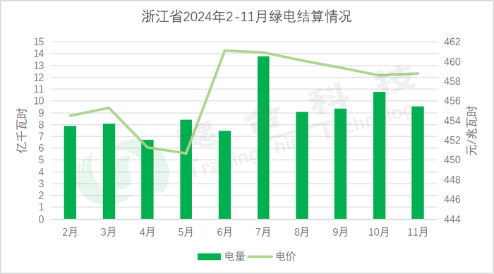 2024年,浙江电力交易中心配合北京电力交易中心组织绿电交易25场,成交电量合计113.59亿千瓦时。2024年2-11月浙江省结算绿电约91亿千瓦时,均价457.49元/兆瓦时,分月情况如下。