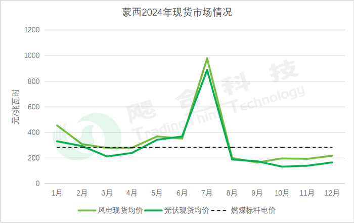 蒙西光伏装机占比较高,受供需条件影响,午间时段光伏集中出力下极易出现现货价格为0元/兆瓦时的极端情况;而其余非午间时段现货价格受市场垄断因素显著影响,在蒙西火电机组“抱团策略”下呈现出明显的高峰时段。2024年市场实时现货均价484.67元/兆瓦时,其中风电现货均价332.72元/兆瓦时,光伏现货均价289.52元/兆瓦时。