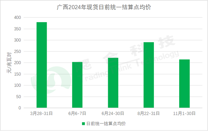 广西2024年在四个季度均开展了现货结算试运行,现货期间日前统一结算点算数平均价为262.05元/兆瓦时,较燃煤标杆电价降低158.65元/兆瓦时。