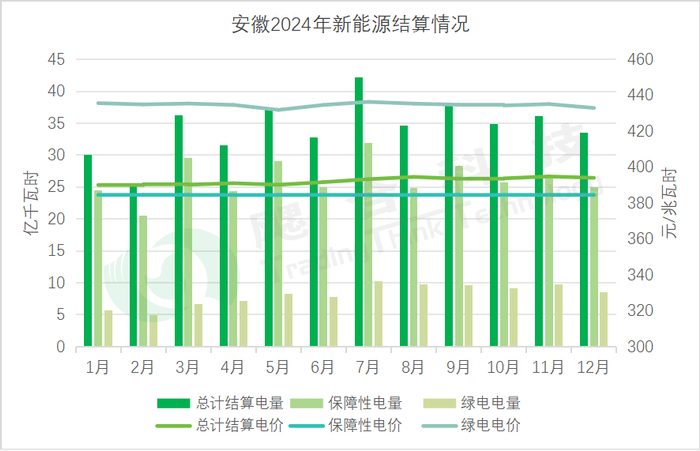 安徽2024年新能源总计结算电量412.62亿千瓦时,结算均价392.35元/兆瓦时。其中保障性电量315.20亿千瓦时,结算均价384.49元/兆瓦时;绿电结算电量97.43亿千瓦时,结算均价434.64元/兆瓦时。