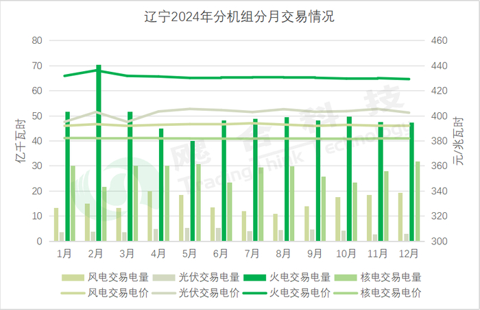 辽宁2024年火电总计交易电量597.63亿千瓦时,交易均价431.29元/兆瓦时;核电交易电量334.73亿千瓦时,交易均价381.97元/兆瓦时;风电交易电量185.87亿千瓦时,交易均价392.70元/兆瓦时;光伏交易电量50.01亿千瓦时,交易均价402.76元/兆瓦时。