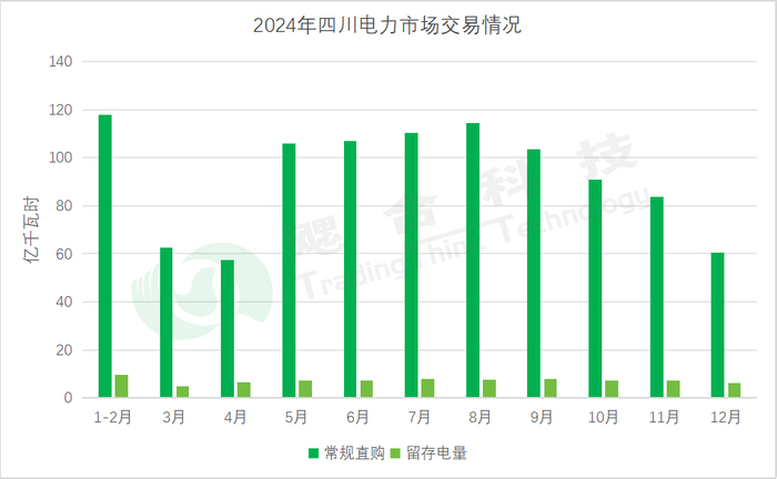 2024年四川省内市场化交易水电(风光)电量共计1259.16亿千瓦时,同比减少8.23%,其中常规直购1013.54亿千瓦时,弃水电量消纳108.22亿千瓦时,省内绿电57.60亿千瓦时,绿电均价337.95元/兆瓦时,留存电量79.80亿千瓦时。