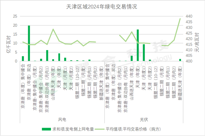 2024年天津电力市场绿电年内累计交易电量69.91亿千瓦时,交易均价416.85元/兆瓦时(包含环境权益价格)。各交易类型成交情况如下图示。