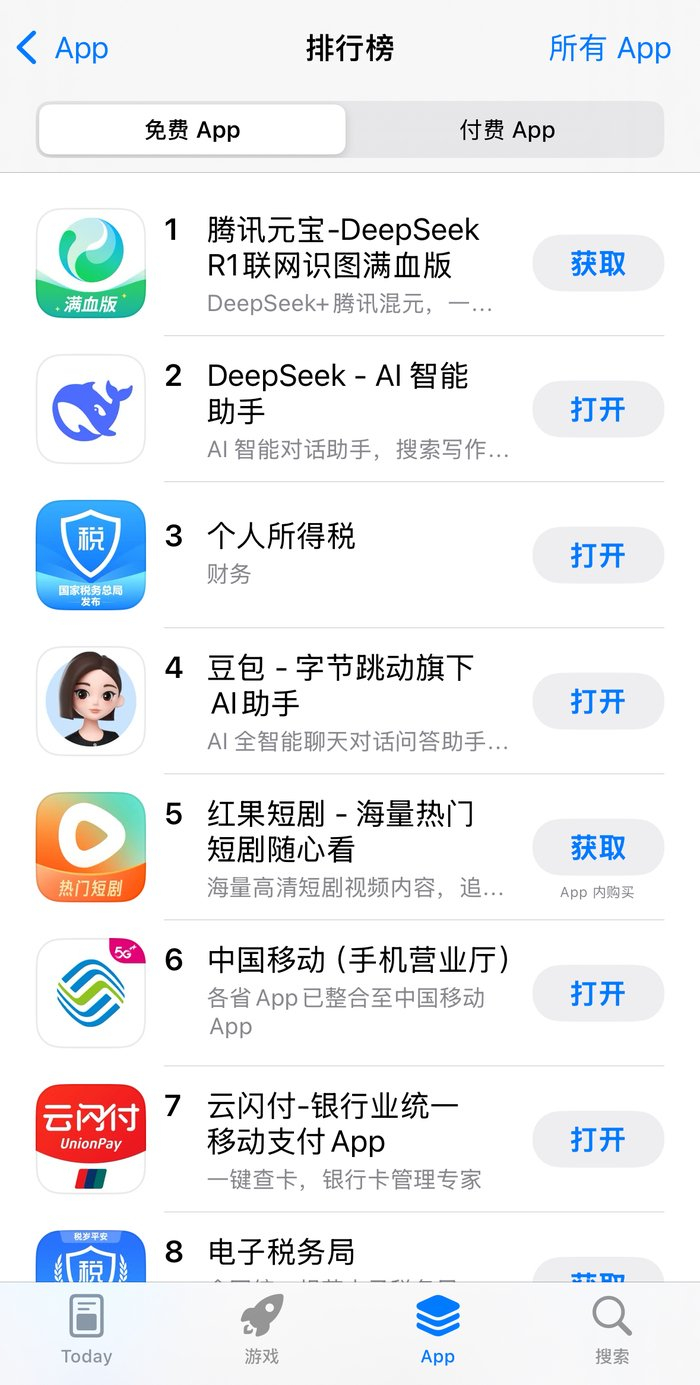 超越豆包后再超DeepSeek,腾讯元宝登顶苹果免费下载榜