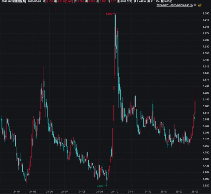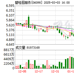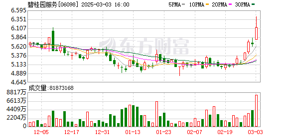 到去年9月中旬碧桂园服务一度跌至3.92港元/股的位置,此后出现反弹,到10月初曾涨至8.39港元/股的高位;今年年初碧桂园服务股价继续低位震荡,但上周却大涨10.10%,本周一继续上涨8.11%,截至3月3日最新报收6.13港元/股,总市值约为205亿港元。