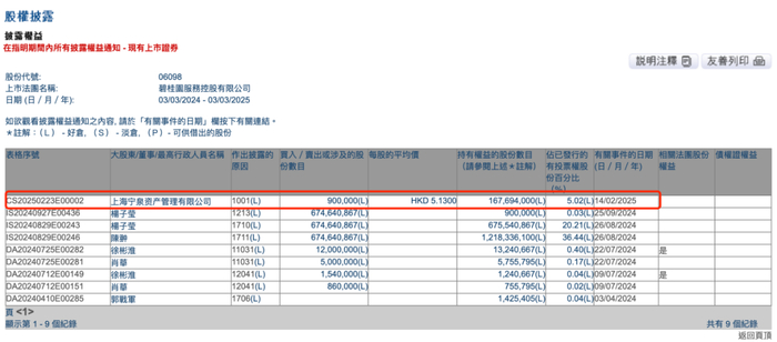 港交所最新的股权披露信息显示,2025年2月14日,上海宁泉资产管理有限公司(以下简称宁泉资产)在二级市场买入碧桂园服务90万股,每股均价为5.13港元,共耗资约461.7万港元。