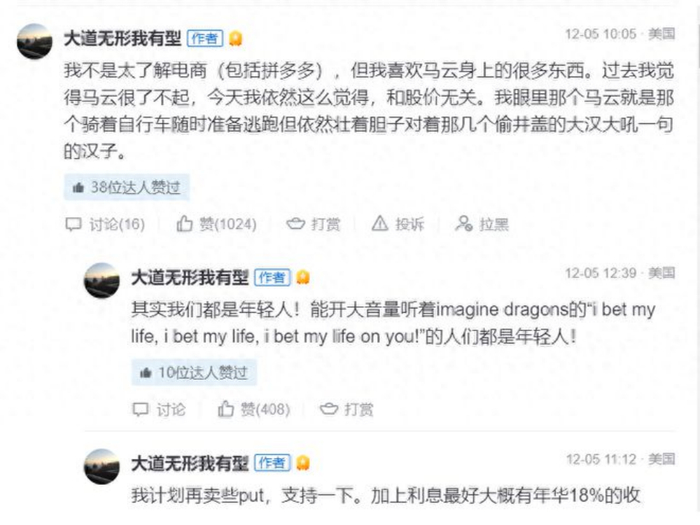 “我不是太了解电商(包括拼多多),但我喜欢马云身上的很多东西。过去我觉得马云很了不起,今天我依然这么觉得,和股价无关。我眼里的马云就是那个骑着自行车随时准备逃跑但依然壮着胆子对着那几个偷井盖的大汉大吼一句的汉子。”