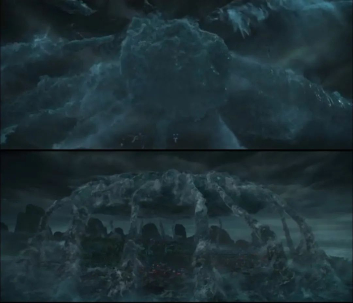 于淼尝试从透视关系出发。他思考,海水破开的宽度比鼎还宽两倍多,也就是整片海被剖开的范围是六七公里。要准确呈现,必须把握正确的比例关系,一比一制作。据《哪吒2》幕后纪录片介绍,天元鼎大概是15个航母的宽度。