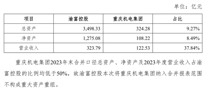 从渝富控股和重庆机电集团2023年的总资产来看,此次并不构成重大资产重组。
