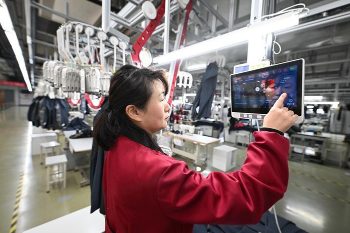 2024年2月29日,在位于无锡市锡山区的红豆股份红豆男装5G智能全连接工厂,检验人员使用吊挂PAD判定产品质量。新华社记者 季春鹏 摄