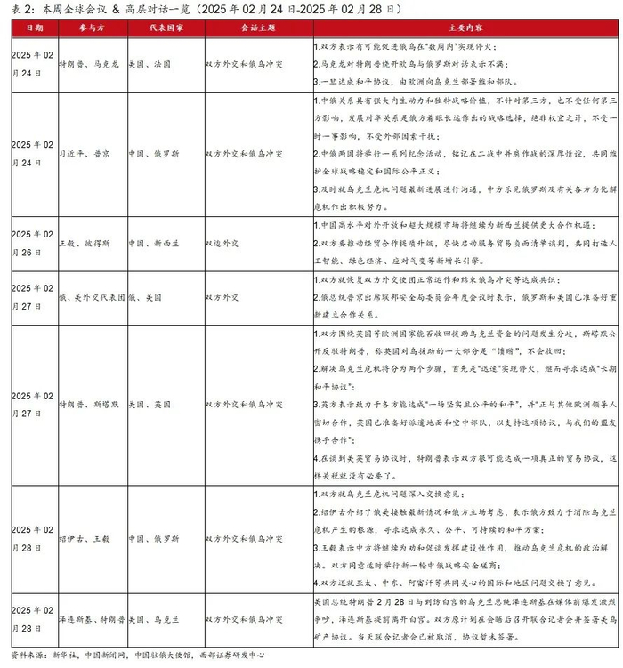 本周全球进行了多场高级别会议,主要问题聚焦于俄乌冲突这一核心地缘政治事件。例如2月24日,法国总统马克龙到访华盛顿访问美国总统特朗普,就俄乌问题展开深入讨论。同日,中国国家主席习近平应约同俄罗斯总统普京通电话,也再次提到俄乌问题的最新进展。2月27日,美国总统特朗普与英国首相斯塔默在白宫会晤,讨论了包括俄乌问题在内的一系列合作议题。但斯塔默在会议中公开反驳特朗普,称英国对乌援助的一大部分是“馈赠”,不会收回。当日稍早时候,俄美外交部代表在土耳其伊斯坦布尔以闭门形式举行6.5小时的双边谈判。据双方接近此次会谈的消息人士透露,这次会谈主要讨论的是双方驻对方国家使馆运作问题,涉及人员配置、签证等。当地时间2月28日,俄罗斯联邦安全会议秘书绍伊古抵达北京与中方会谈。双方就乌克兰危机问题深入交换意见。绍伊古介绍了俄美接触最新情况和俄方立场考虑。而同日,泽连斯基访问美国,但与特朗普在媒体面前发生激烈争吵,最终提前离开美国白宫,此前预期要签署的美乌矿产协议也因此搁置。