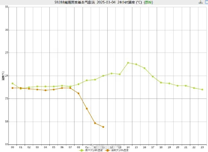 南海国家站录得气温17.3℃,较昨日同期下降6-7℃。