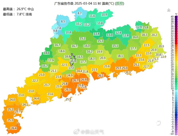 11时广东省气温图都变得五彩斑斓的。
