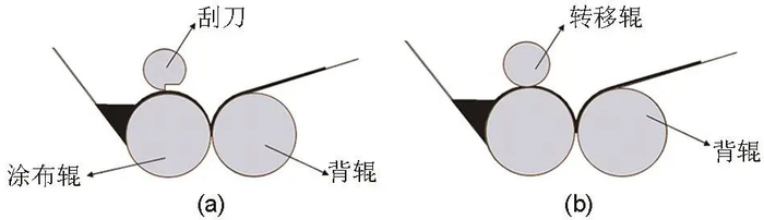 转移式涂布常见的有两种:刮刀转移涂布[图4(a)]以及双辊转移式涂布[图4(b)]。刮刀转移式涂布机结构相比于刮刀涂布机多了一个背辊。涂布原理相似,与之不同的是浆料是通过涂布辊与背辊之间的相逆转动将浆料转移到铜箔或铝箔上的。而双辊转移式涂布用转移辊替代了传统的刮刀,通过双辊之间的间隙调节浆料的转移量,然后再通过背辊与涂布辊的相逆转动达到涂布目的。