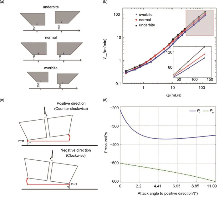 图10(a) 不同模头结构;(b) 不同模头结构下的涂布速度;(c) 模头倾斜角度;(d) 不同倾斜角度下出口处及上游弯月面压力变化