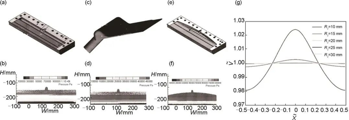 图8(a) 双腔体;(b) 梯度式腔体;(c) 衣架式腔体;(d) 双腔体压力分布云图;(e) 梯度式腔体压力分布云图;(f) 衣架式腔体压力分布云图;(g) 不同腔体大小速度分布
