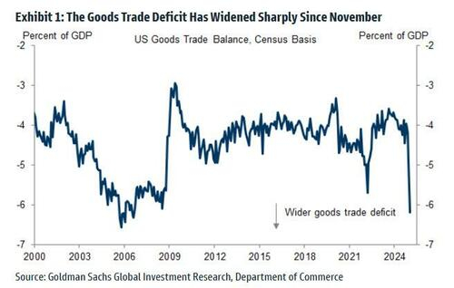 正如高盛经济学家Manuel Abecasis在下图中所展示的那样,1月份商品贸易差额升至了GDP的6%以上,导致投资者担心第一季度GDP数据疲软。GDP预测的暴跌是进口激增的直接结果。