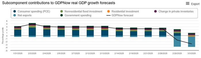 财联社3月4日讯(编辑 潇湘)关注全球资本市场的投资者,过去几天或许都被一组预测指标所震惊了:亚特兰大联储的GDPNow模型对2025年美国第一季度GDP的预估值,在短短两个交易日就骤降了5.1个百分点——从+2.3%急速坠落至了-2.8%。