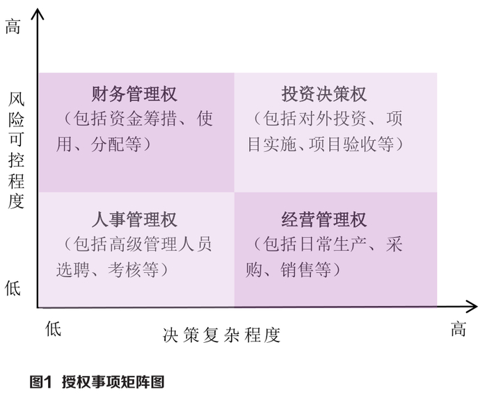 具体来讲,国有企业应坚持对各类授权事项“可授可收”,以“董事会评价+动态调整”为手段,建立健全对子公司董事会适度授权、分类管理、有效监督的动态授权管理机制,形成授权、监管、评价、调整的闭环管理体系。授权过程中,应制定母、子公司权责与授、放权清单,落实精细化管理。横向上,可根据权责进行划分,明确各类事项涉及公司总部的层级,以及最终决策主体。纵向上,可根据事项进行分类,例如绝对管控事项,包括子公司章程、主责主业、改革重组、年度经营计划等重大事项;禁止事项,禁止子公司从事的业务活动或者非主业投资等;授权事项,根据子公司董事会建设水平谨慎授权,考量决策复杂程度、风险可控程度,给予一定权限内的经营管理权、投资决策权、财务管理权和人事管理权等(见表3、图1)。
