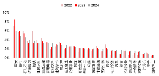 图8:2022-2024年申万一级行业的市场年度股息率(年度实际现金分红总额/年末境内总市值)