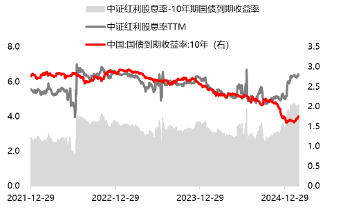 当经济增速放缓/低利率环境,高股息策略的防御性凸显,市场更关注高分红企业。经济增长中枢下移带动利率下行,派息率逐步提升,高股息资产相对占优。经济数据波动使得长端国债利率走弱,中证红利股息率与10年期国债收益率的差值已突破 2022 年以来常态区间上沿,对于长线资金的配置性价比凸显。