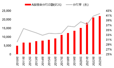2010年至2023年,A股分红额攀升,分红率整体呈上升趋势。2024年4月12日,国务院发布新“国九条”,明确提出强化上市公司现金分红监管,对多年未分红或分红比例偏低的公司,限制大股东减持并实施风险警示。在监管引导下,多家上市公司发布未来三年股东回报规划,提升了投资吸引力。2023年全A股分红额达到2.2万亿元,整体分红率达到41.9%。