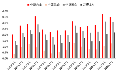央国企是A股市场现金分红的主要力量。2010 年以来,股息率绝对值呈现出央企>国企>全A>民企的特性。2023 年,中证央企股息率达 3.52%,中证国企股息率为 3.10%,万得全A股息率为 2.19%,而中证民企股息率仅为1.27%。