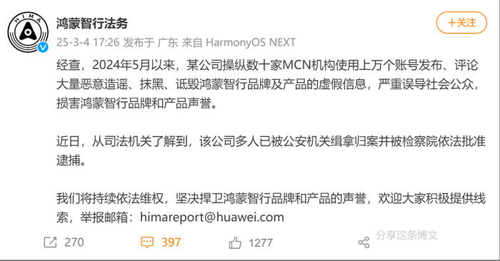 3月4日,鸿蒙智行法务发布首条微博称:经查,2024年5月以来,某公司操纵数十家MCN机构使用上万个账号发布、评论大量恶意造谣、抹黑、诋毁鸿蒙智行品牌及产品的虚假信息,严重误导社会公众,损害鸿蒙智行品牌和产品声誉。近日,从司法机关了解到,该公司多人已被公安机关缉拿归案并被检察院依法批准逮捕。