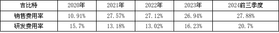 表3:吉比特2020年至2024年前三季度销售费用率和研发费用率情况