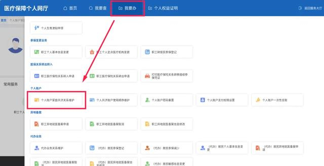 1.登录“北京医保公共服务平台”,进入“医疗保障个人网厅”界面,点击菜单栏的“我要办”模块,选择“个人账户家庭共济关系维护”功能。