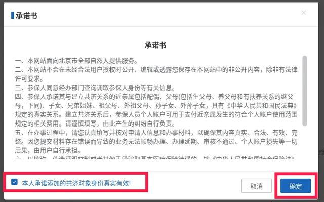 2. 查看承诺书,勾选“本人承诺添加的共济对象身份真实有效!”,点击“确定”按钮。