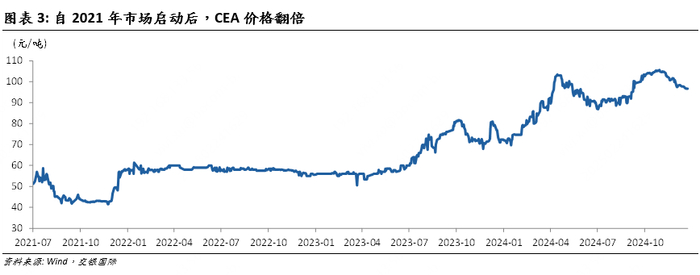 CCER市场重启或提升碳市场活跃度,与CEA市场相辅相承。从停滞到重启,中国核证自愿减排量(CCER)市场经历了一个重要的转折。2024年,CCER 平均成交价为93元/吨,按年上升23%,价格走势与CEA贴近。我们认为CCER市场对新项目申请的重启能一定程度提升碳市场的活跃度,同时亦能促进其它除主流再生能源外的绿色低碳技术发展。