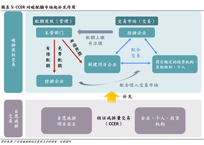 CCER 与碳排放配额的不同之处,在于配额交易是基于预先确定的碳排放总量控制下的交易机制,卖方是售出经节约排放后的碳配额盈余。减排量则是经监测及核证后,经官方签发后才可以有准确数量的减排量。